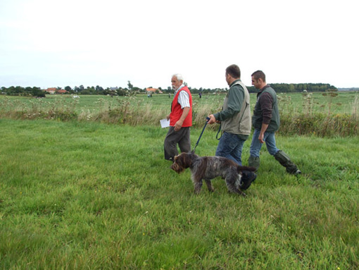 Photo de néophyte en baskets dans les labours mais qui avec l'aide de MM Renard et Bouvet, juges, va quand même conduire son chien au succès.